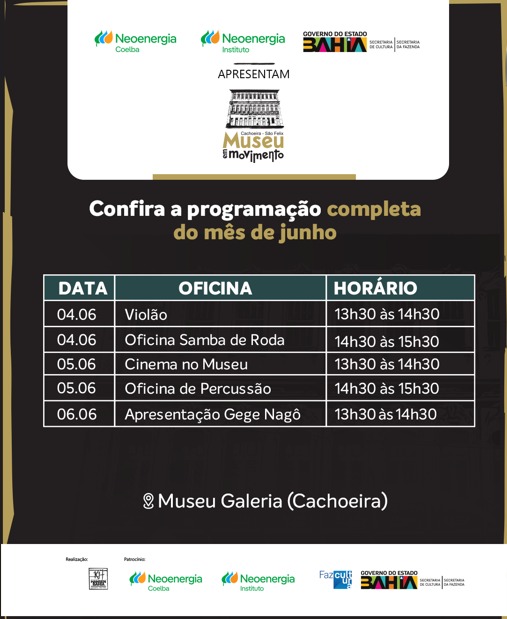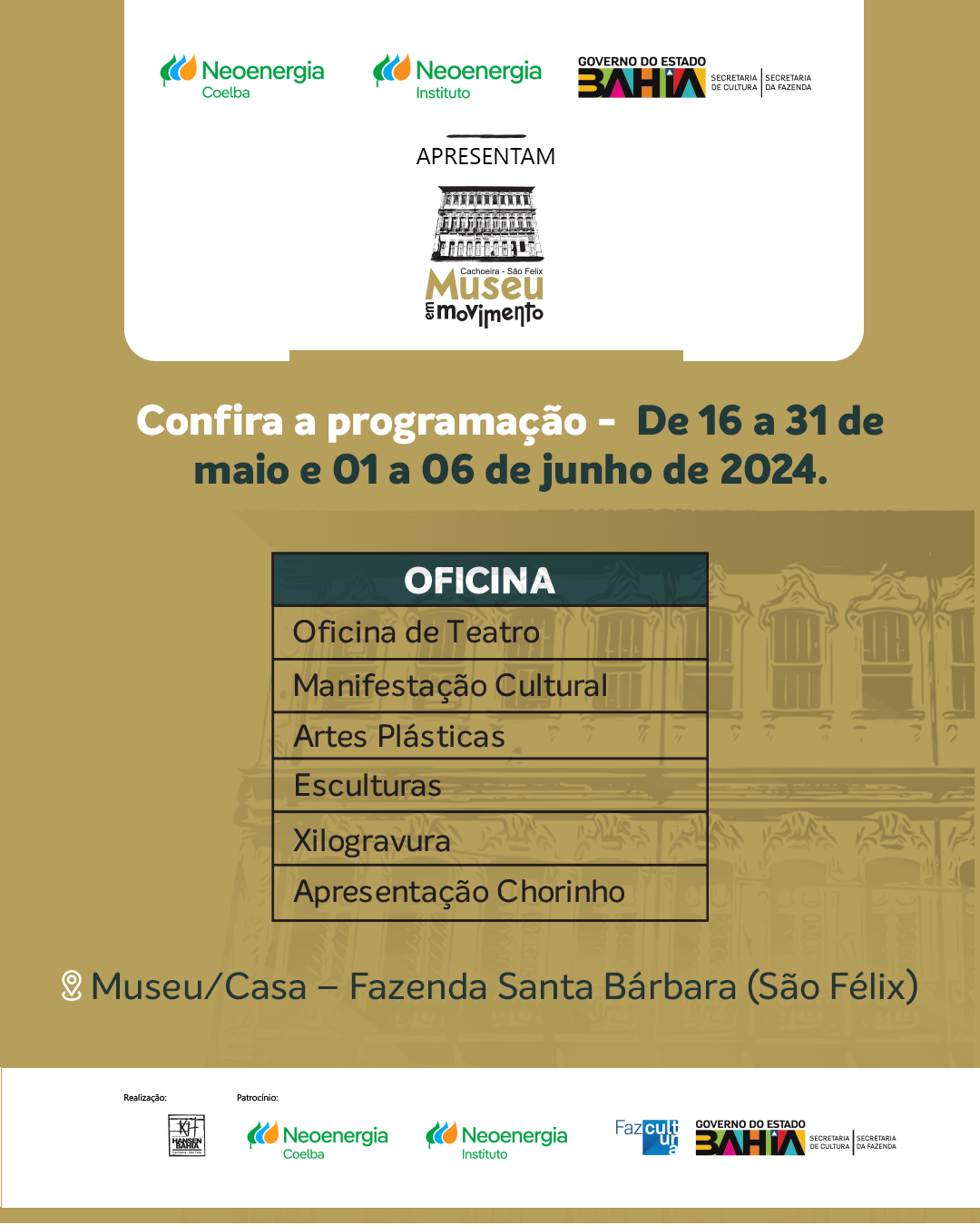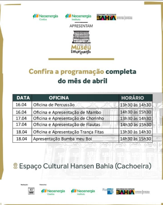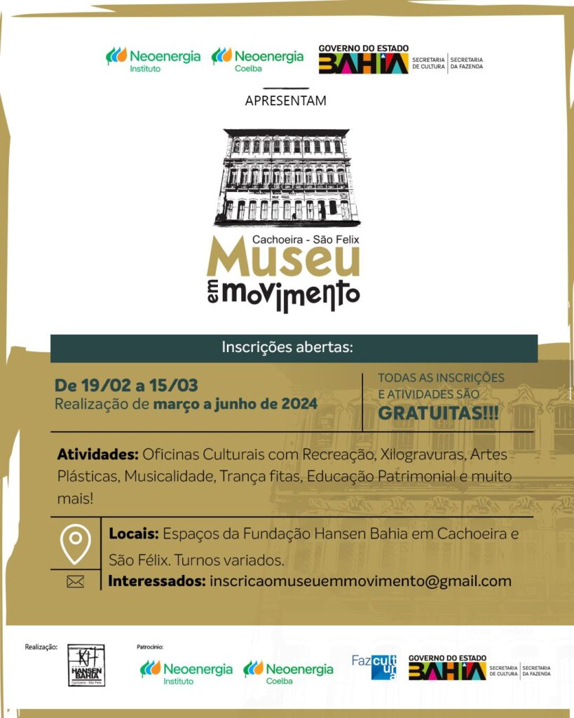 O projeto “Museu em Movimento”, foi realizado pela Fundação Hansen Bahia, contou com o patrocínio da NEOENERGIA COELBA e INSTITUTO NEOENERGIA, por meio do EDITAL TRANSFORMANDO ENERGIA EM CULTURA, via Lei de Incentivo Fiscal pelo Fazcultura, direcionado pelo Governo do Estado, Secretaria de Cultura e Secretaria da Fazenda. As atividades tiveram com o apoio e parceria das Prefeituras Municipais de Cachoeira e de São Félix.