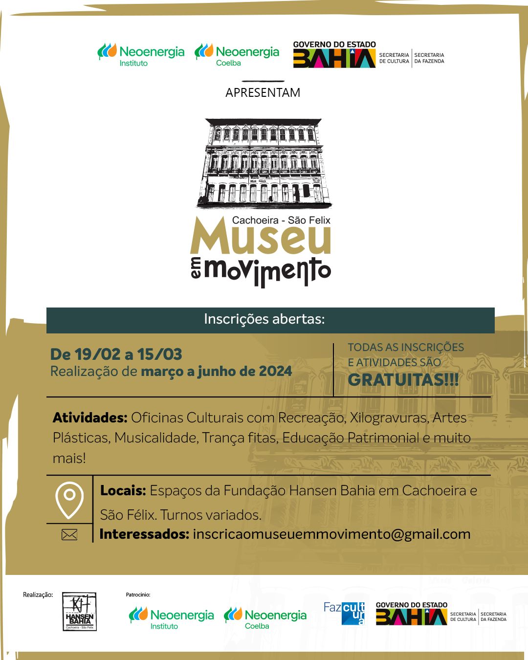 O projeto “Museu em Movimento”, foi realizado pela Fundação Hansen Bahia, contou com o patrocínio da NEOENERGIA COELBA e INSTITUTO NEOENERGIA, por meio do EDITAL TRANSFORMANDO ENERGIA EM CULTURA, via Lei de Incentivo Fiscal pelo Fazcultura, direcionado pelo Governo do Estado, Secretaria de Cultura e Secretaria da Fazenda. As atividades tiveram com o apoio e parceria das Prefeituras Municipais de Cachoeira e de São Félix.